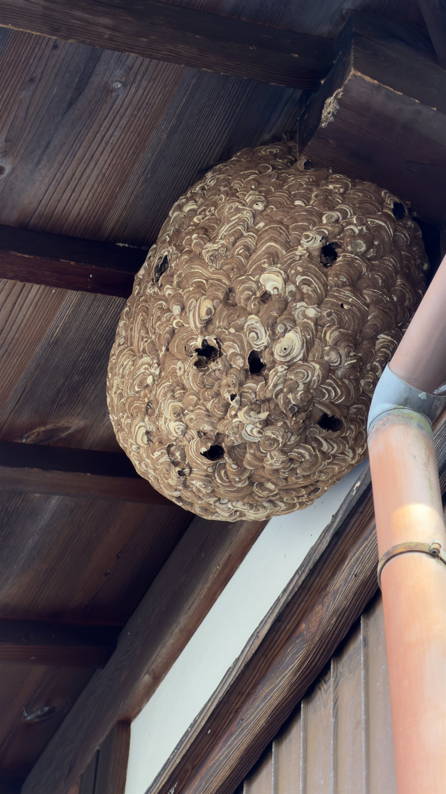 甲賀市希望ヶ丘のお客様より、空き家裏の軒下に作られた古いコガタスズメバチの巣の駆除依頼を承りました。スズメバチバスターとしてYoutubeでも活躍中のベテランスタッフ中川が担当し、迅速かつ安全に駆除作業を完了しました。